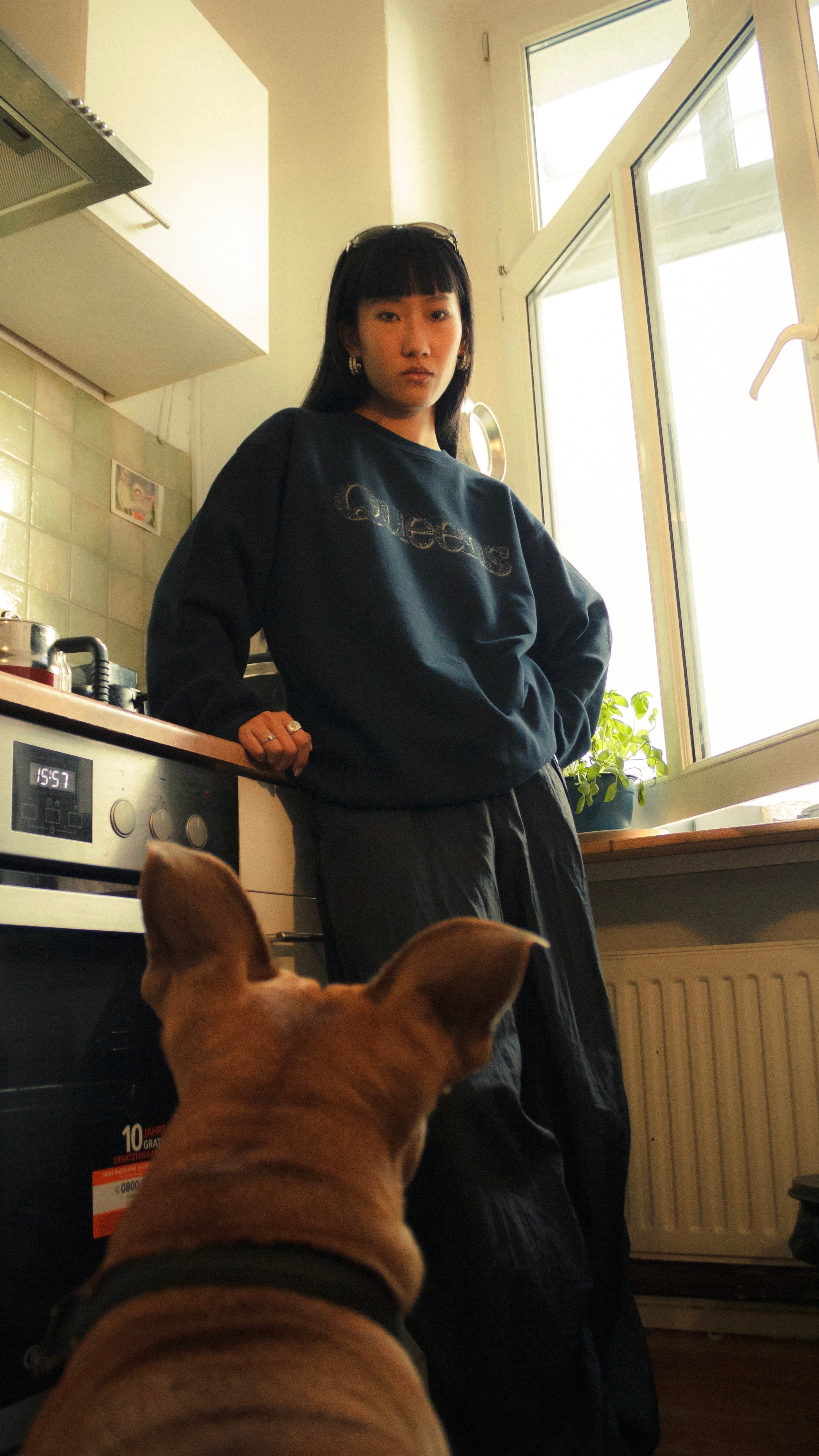 Queens logo crewは、鮮やかなネイビーのボディにカラーシルバーのロゴが際立つ一枚です。
